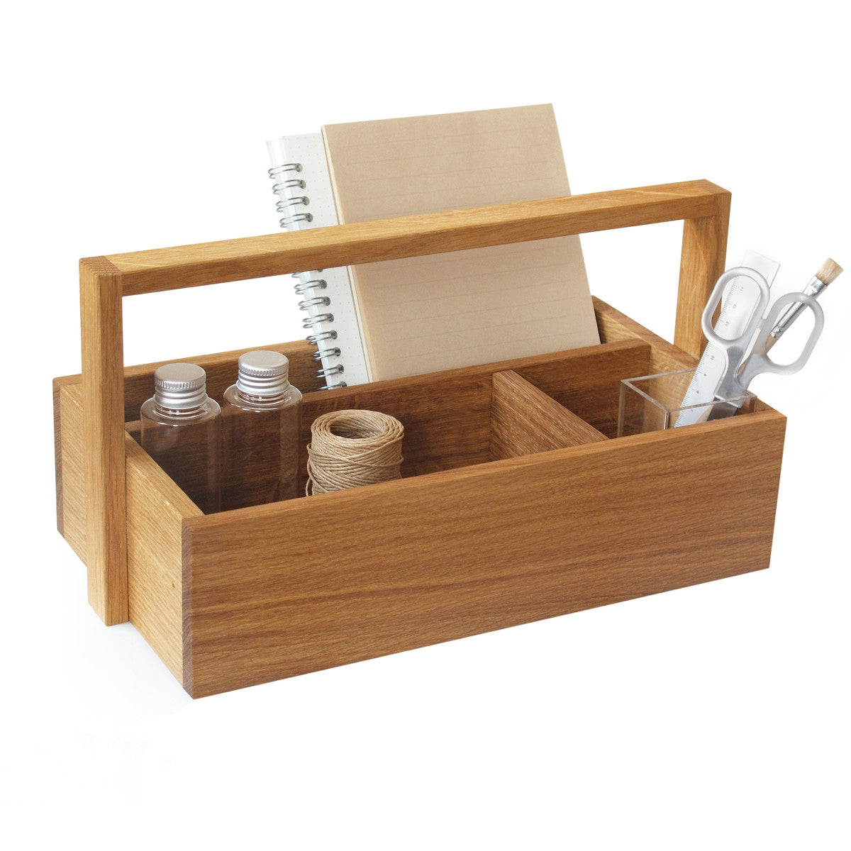 Gefertigt aus geölter Eiche überzeugt die Box durch ihre hochwertige Verarbeitung, natürliche Optik und lange Haltbarkeit. Der praktische Tragegriff sorgt dafür, dass Sie Ihre Utensilien bequem von einem Ort zum anderen transportieren können.