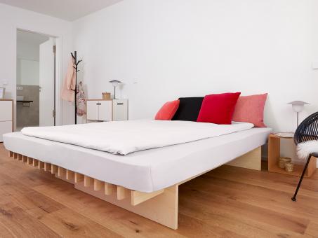 Die Anzahl der Latten richtet sich nach der gewählten Breite und kann bei Bedarf ergänzt werden. Das unbehandelte Buche-Multiplex-Material sorgt für eine natürliche, langlebige Optik – perfekt für moderne und nachhaltige Schlafzimmer.