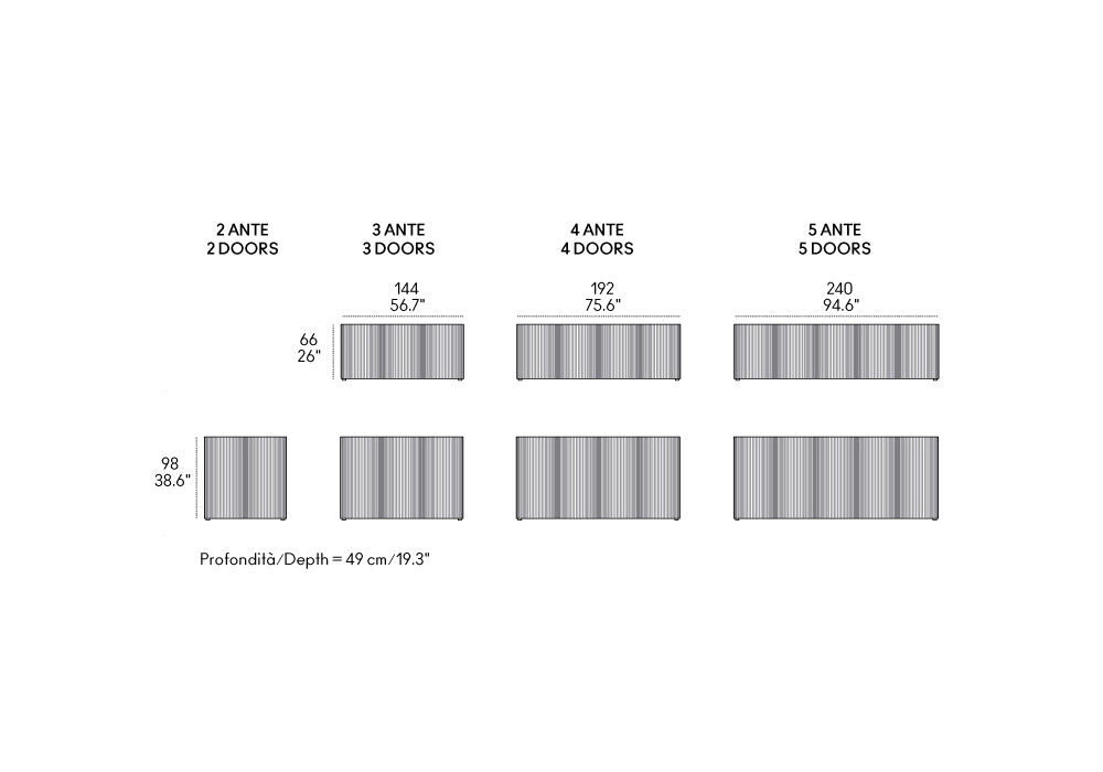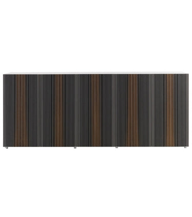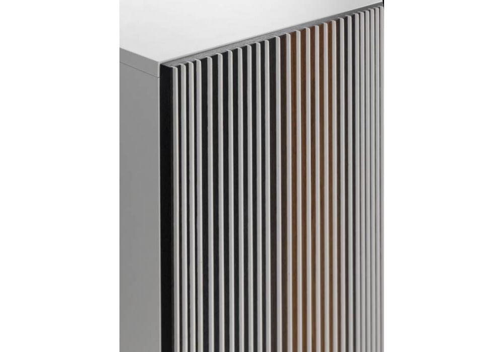- Türen: MDF-Wabenstruktur mit Metallverstärkung, furniert in wärmebehandelter Eiche, vertikal gefräst mit weißen Laminateinsätzen