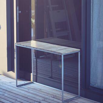 Der Lux Konsolentisch von Jan Kurtz fügt sich nahtlos in verschiedene Einrichtungsstile ein und dient als praktische Ablagefläche im Flur, Wohnzimmer oder Schlafzimmer. Die Teakleisten auf dem schlanken Edelstahlgestell bilden eine großzügige und ästhetisch ansprechende Oberfläche.