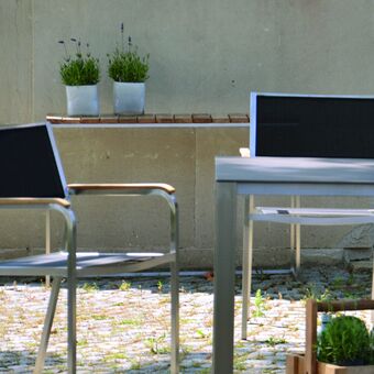 - Tischplatte: Naturbelassene Teakleisten, die nicht nur robust sind, sondern auch eine warme und natürliche Ausstrahlung verleihen.