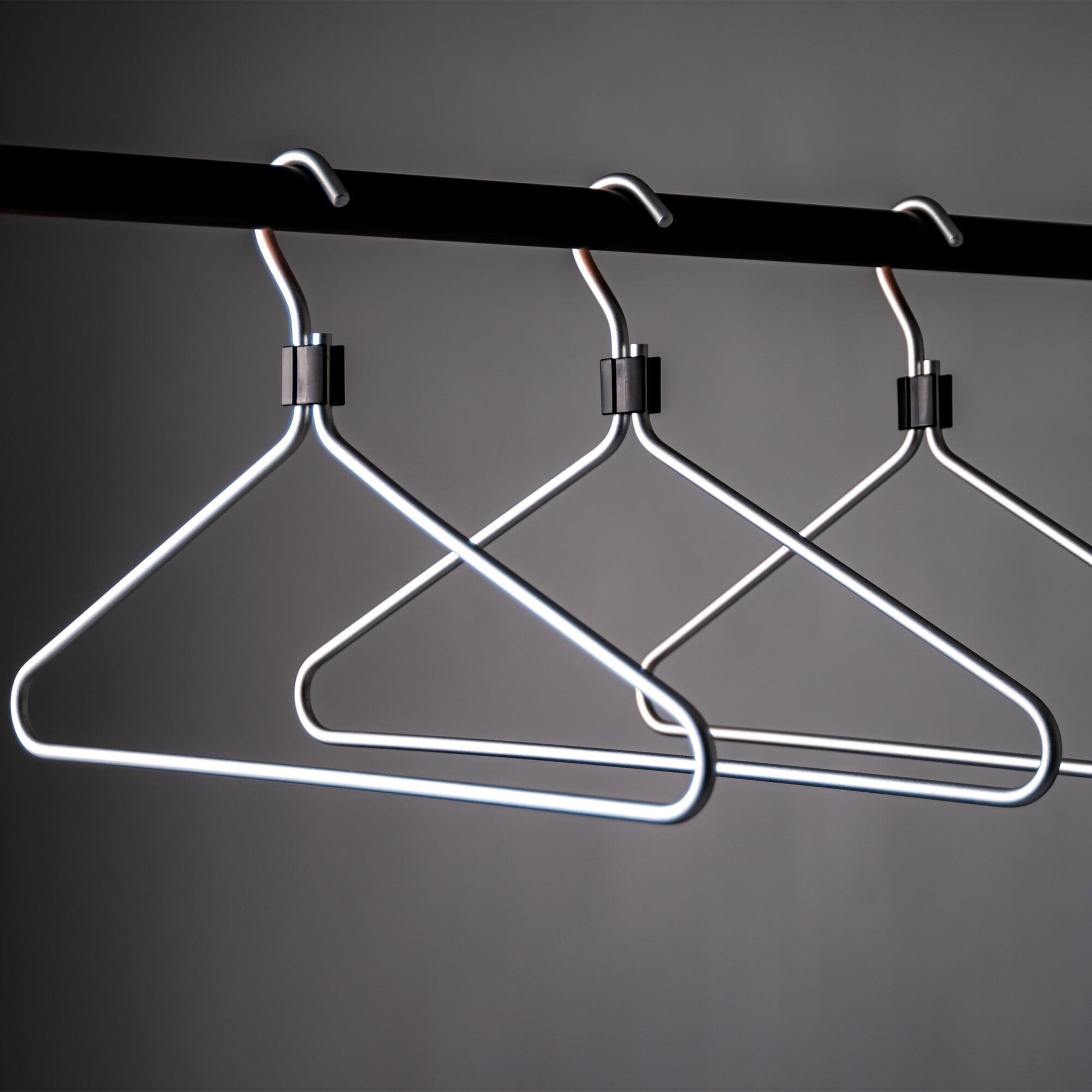 Die Kleiderbügel aus Aluminium von radius design verbinden zeitlose Eleganz mit funktionalem Minimalismus. Gefertigt aus eloxiertem Aluminium und ergänzt durch eine robuste Kunststoffklammer, bieten sie hochwertige Stabilität und sorgen dafür, dass Ihre Kleidung stets perfekt in Form bleibt.