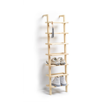 Das schlanke Regal bietet Platz für bis zu 7 Paar Schuhe und nutzt die Höhe optimal aus – ideal für kleine Wohnungen oder enge Dielen. Ein integrierter Metall-Schuhlöffel macht den täglichen Gebrauch noch komfortabler.