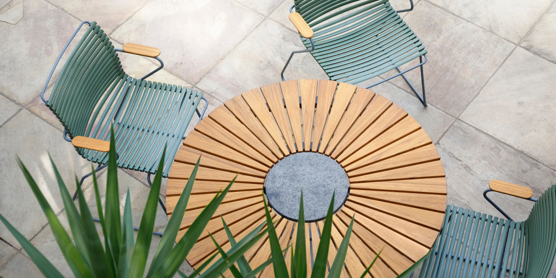 Die runde Form schafft eine harmonische und einladende Atmosphäre – perfekt für den Außenbereich. Die Tischplatte aus lamellenförmigem Bambus verleiht Wärme und Charakter, während das Stein-Element in der Mitte sowohl stilvoll als auch praktisch als Hitzeschutz für Serviergeschirr fungiert.