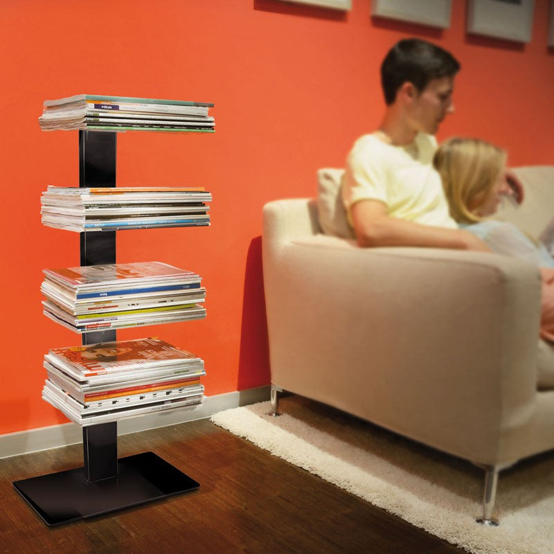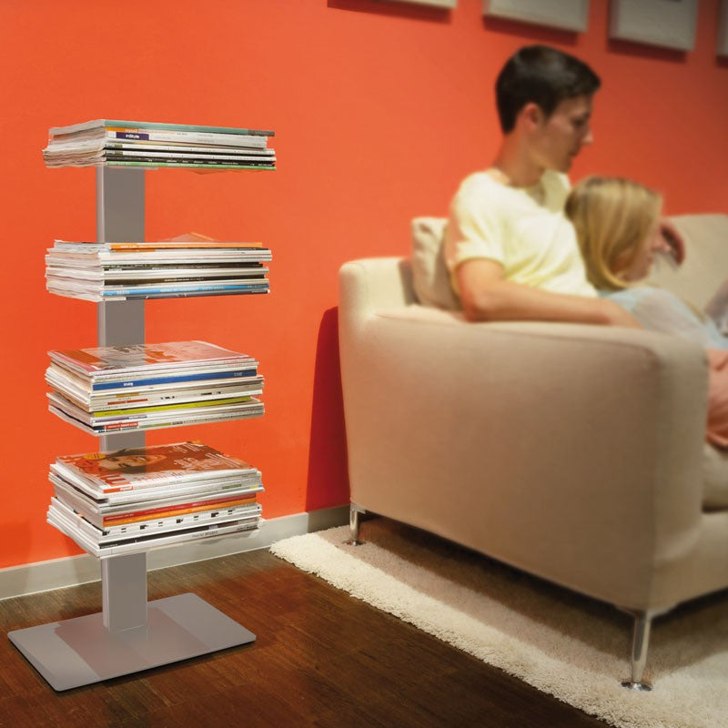 Das Magazinregal "Booksbaum Magazin Stand klein" ist in drei verschiedenen Farben erhältlich: schwarz, weiß und aluminium.