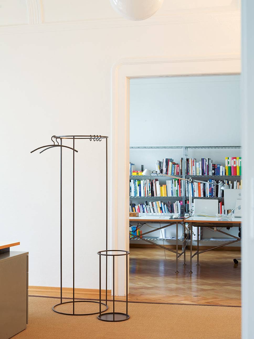 Die senkrechten Stäbe sind über zwei Ringe fest miteinander verschraubt, was dem Ständer seine außergewöhnliche Stabilität verleiht. Mit einem Durchmesser von 55 cm und einer Höhe von 170 cm bietet RACK großzügigen Platz für Mäntel, Jacken und Taschen – und bleibt dabei optisch leicht und dezent. Dank seiner belastbaren Konstruktion trägt der Ständer bis zu 40 kg bei gleichmäßiger Belastung.