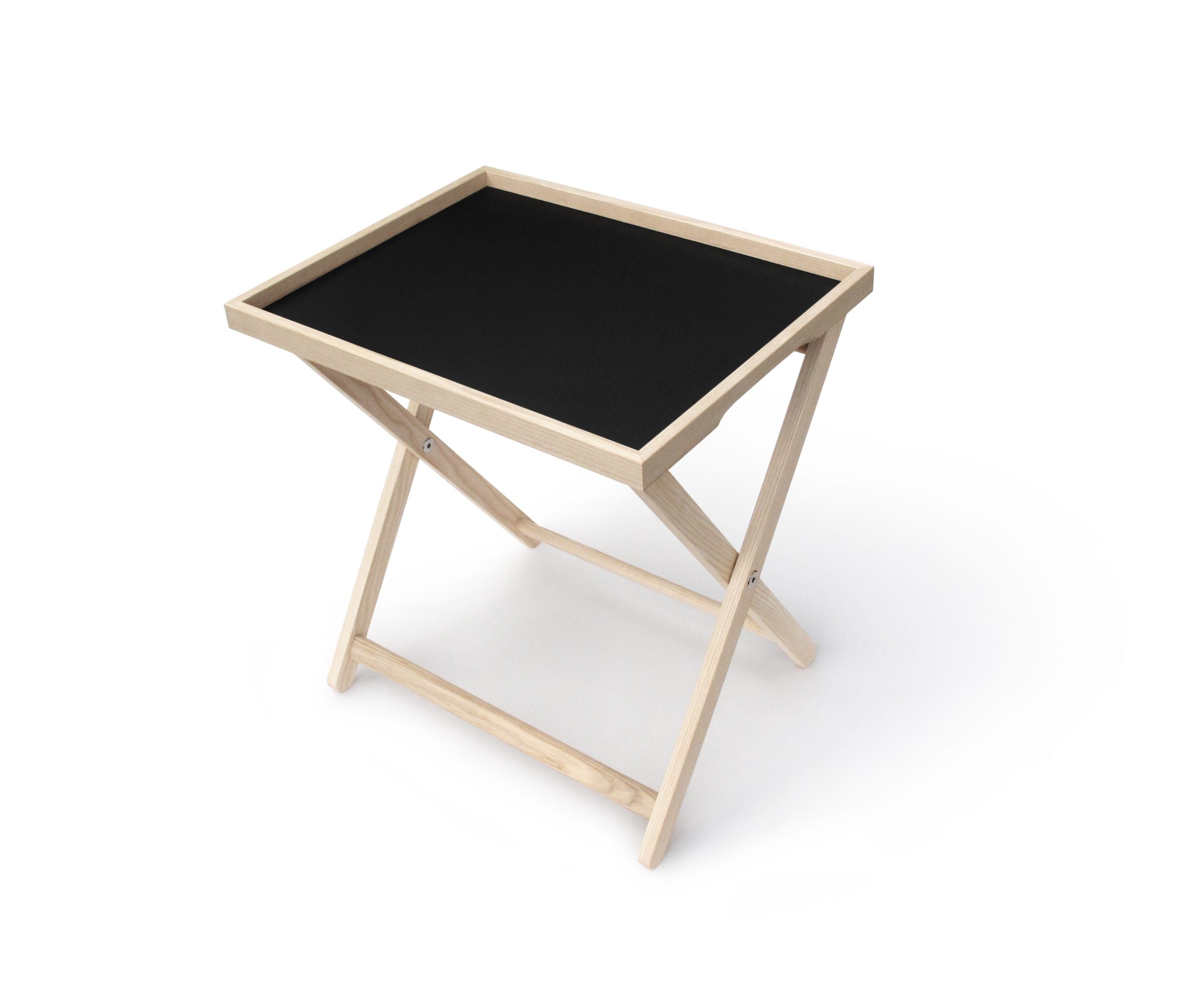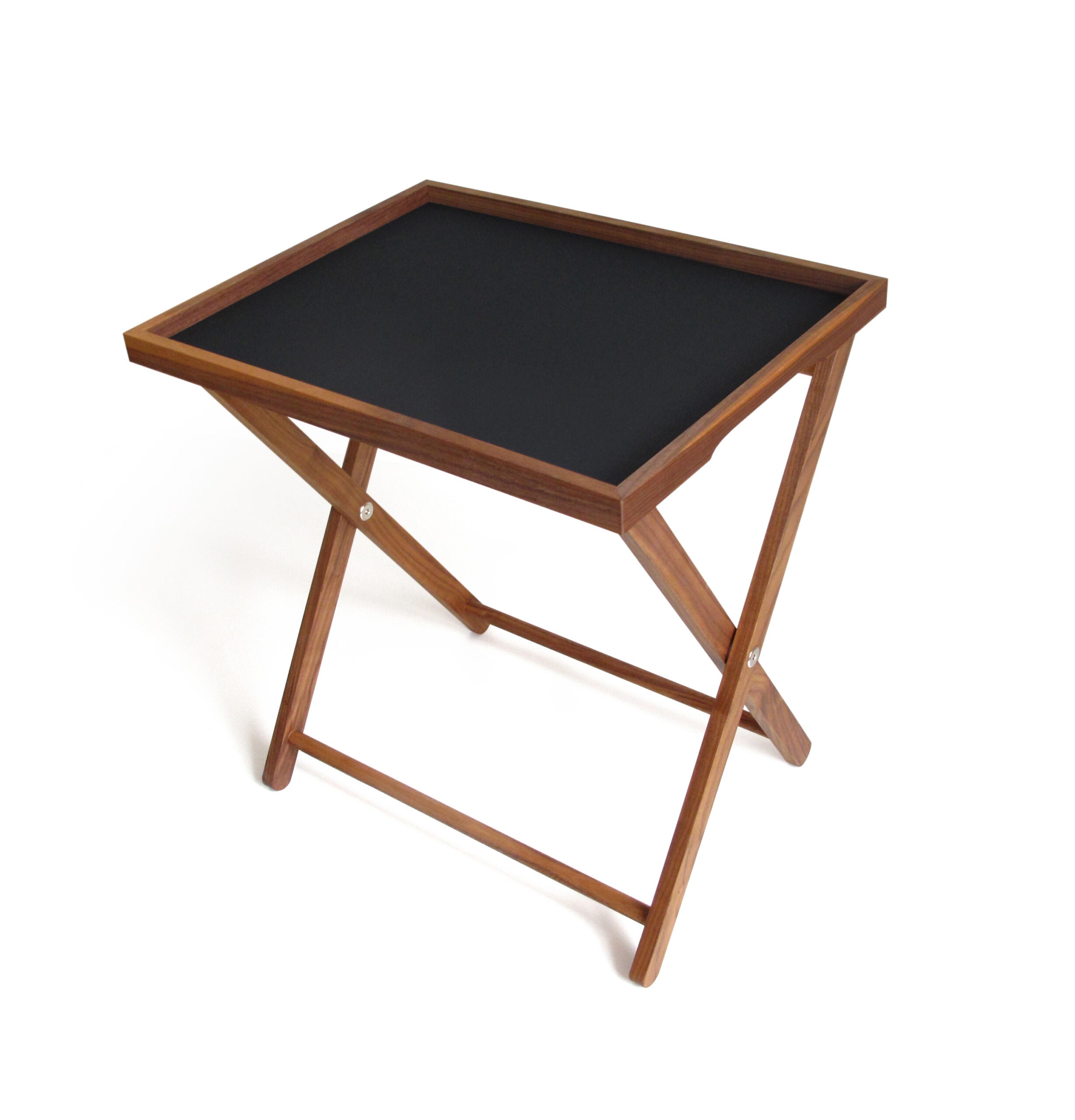 Dank ergonomischer Griffmulden liegt das Tablett sicher in der Hand und transportiert Getränke und Speisen mühelos an ihren Bestimmungsort – oder direkt auf das passende Untergestell. Dieses besteht ebenfalls aus geöltem Nussbaumholz und lässt sich bei Nichtgebrauch platzsparend zusammenklappen.