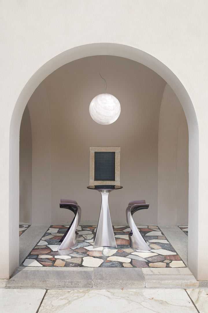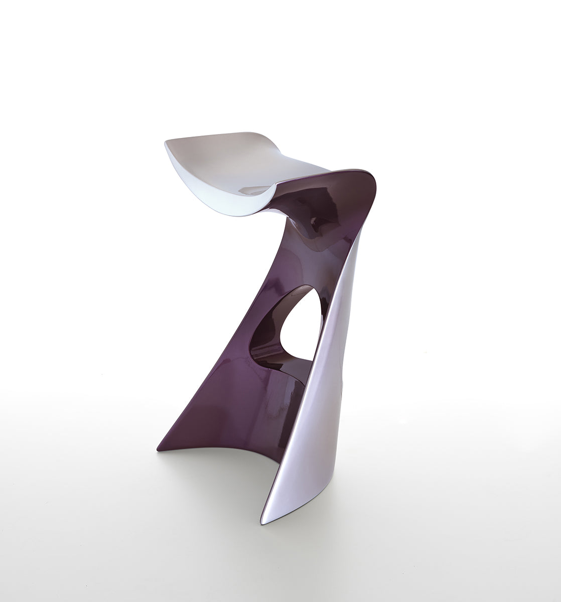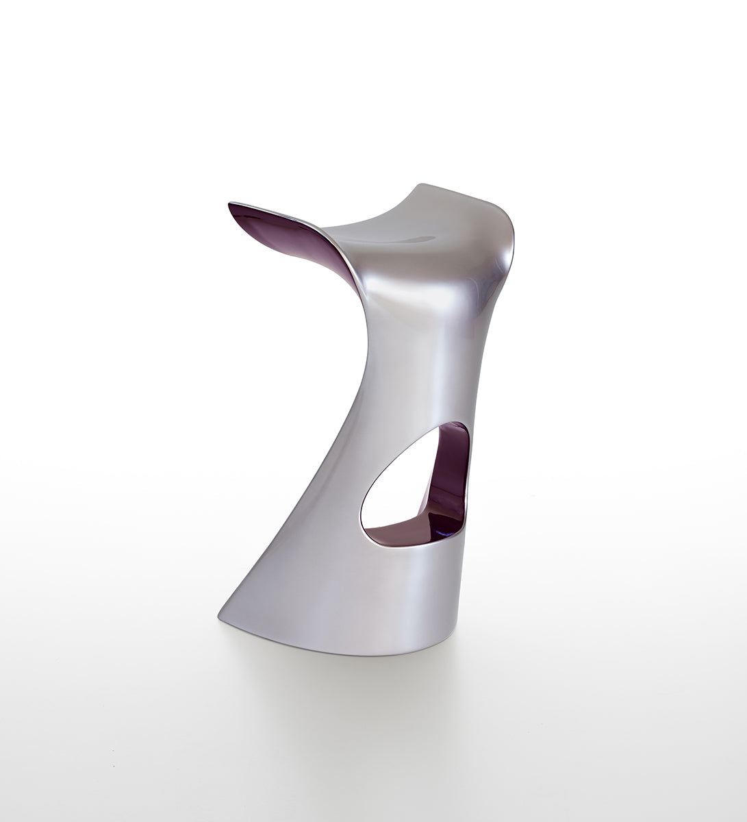 Der KONCORD NEXT besticht durch eine innovative Chrom-Metallic-Lackierung und die markante Kombination aus zwei ausdrucksstarken Farben: Grau und Violett. Diese besondere Ausführung hebt die bereits organischen und dynamischen Linien des Hockers noch stärker hervor und verleiht ihm eine wahrhaft futuristische Aura. Mit seiner aerodynamischen Form ist der KONCORD NEXT nicht nur ein optisches Highlight, sondern auch ein Statement für modernes Wohnen.