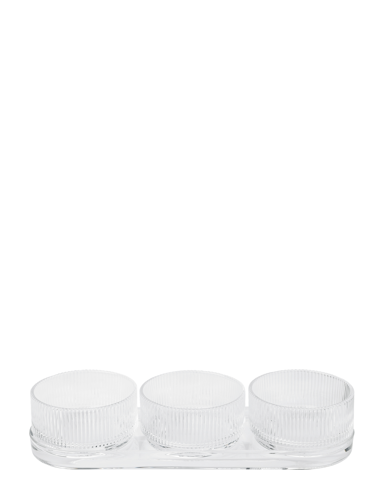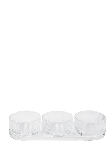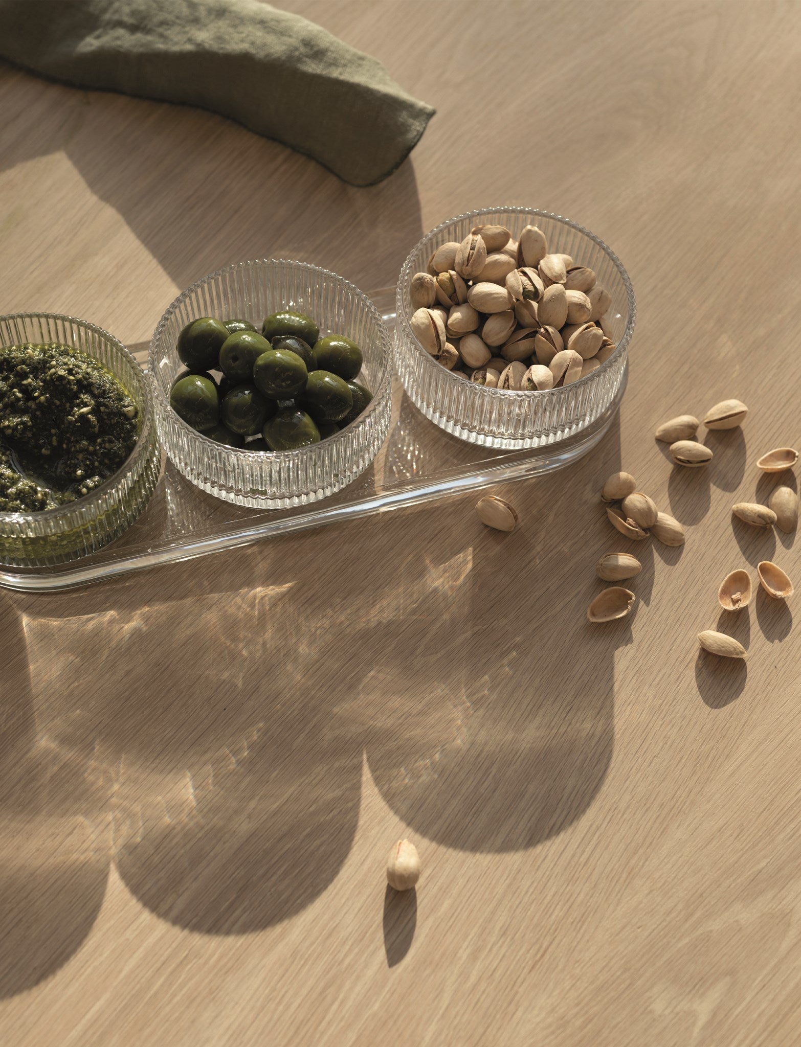 Das geriffelte Pilastro Tapas-Set besteht aus drei Schalen und einer Servierplatte. Die Serie Pilastro ist vom eleganten und funktionalen Art-déco-Stil der 1920er-Jahre inspiriert und hat eine Designsprache, die sich schön in die meisten modernen Einrichtungen einfügt. Das geriffelte Aussehen der Serie Pilastro ergänzt elegant das meiste Geschirr. Schalen und Servierplatte können auch für andere Zwecke genutzt werden – beispielsweise eignet sich die Platte zum Aufbewahren von Hautpflegeprodukten und die Schalen für Schmuck, Schlüssel und Kerzen/Teelichter. Außerdem sind die Schalen ideal zum Servieren von Desserts geeignet. Die Tapasschalen haben einen Durchmesser von 10 cm und sind stapelbar. Gemeinsam mit den anderen Artikeln der Serie Pilastro erzeugt das Pilastro Tapas-Set einen ganzheitlichen Ausdruck auf dem Esstisch.