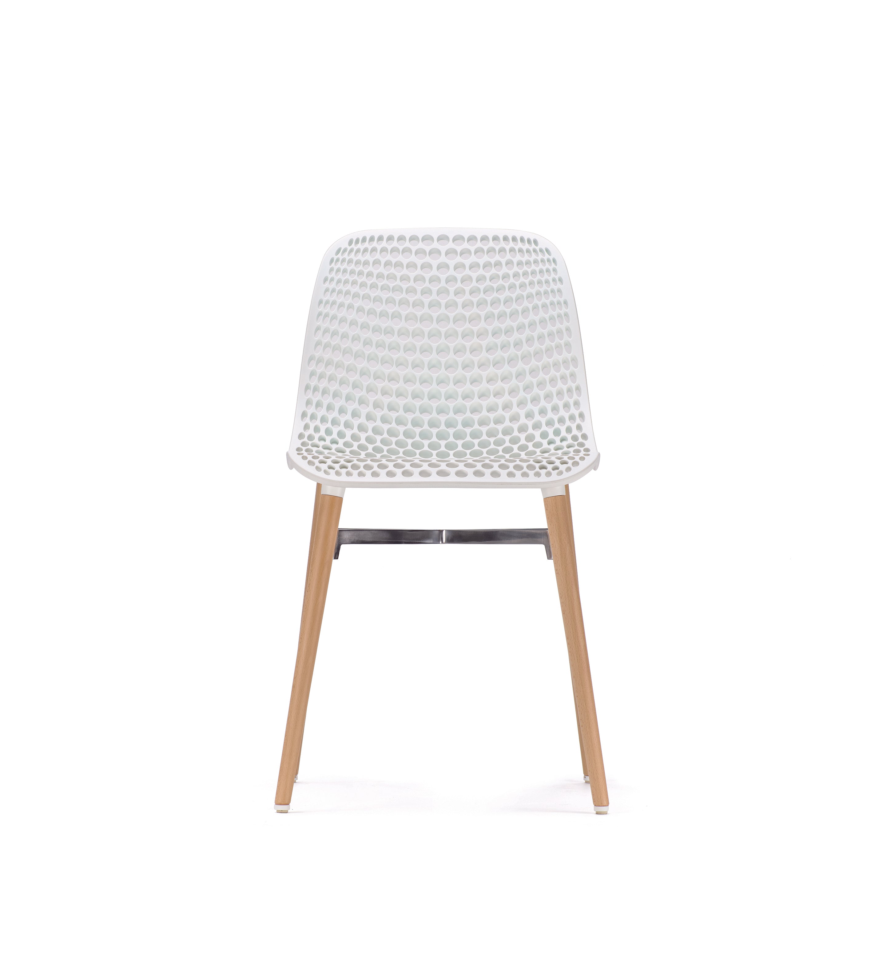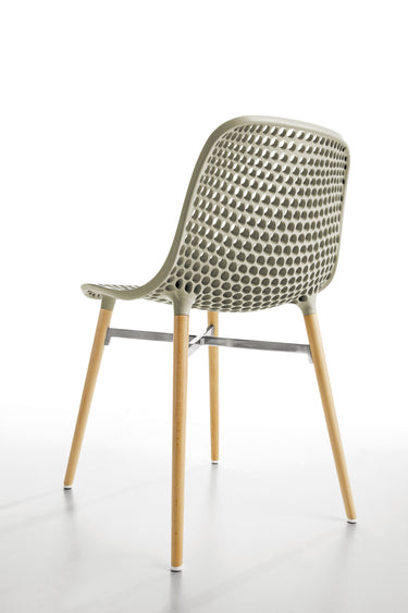 Dank der robusten Konstruktion mit einer perforierten Schale und witterungsbeständigem Iroko-Holz eignet sich der Stuhl auch hervorragend für den Einsatz im Außenbereich. Das harmonische Zusammenspiel der Materialien erzeugt faszinierende Licht- und Schattenspiele, die dem Stuhl seinen einzigartigen Charakter verleihen.