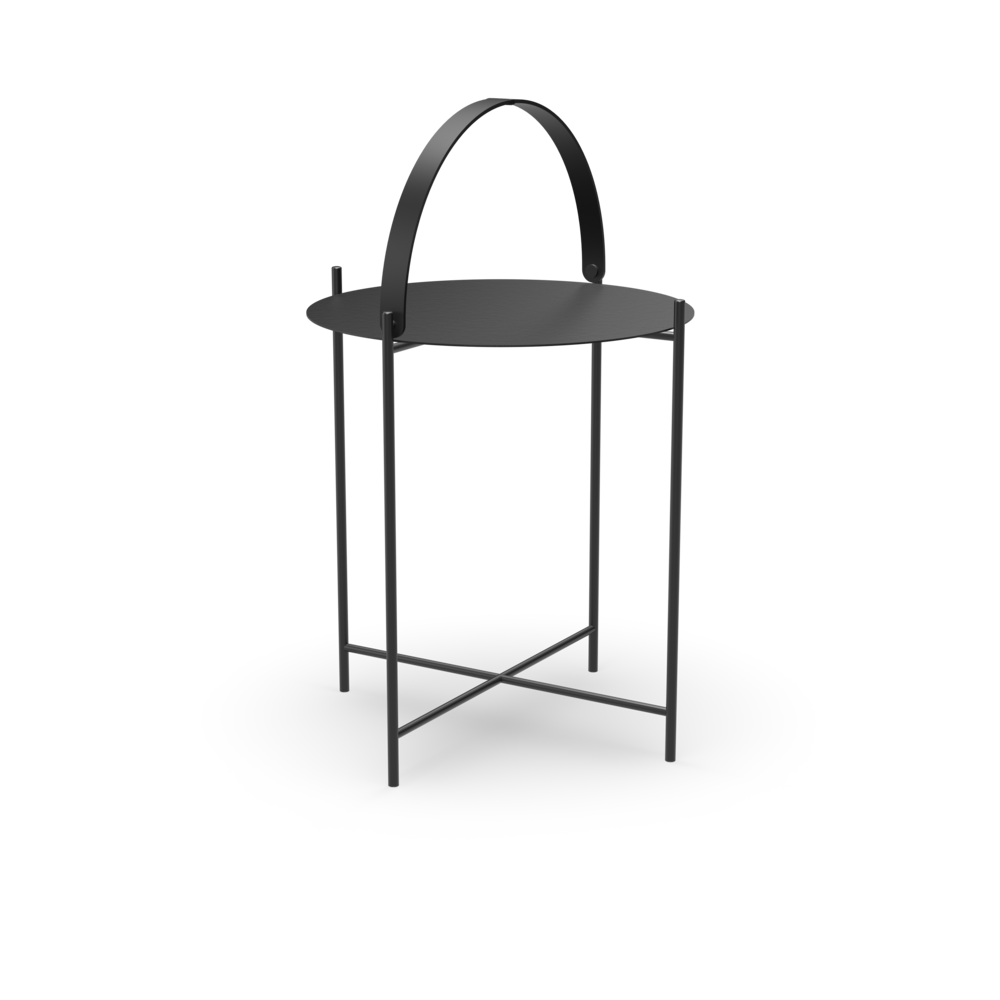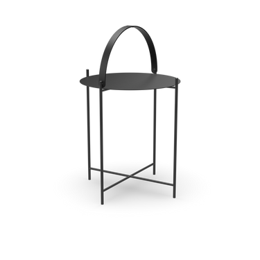 Der halbringförmige Griff macht den Tisch besonders praktisch: Er erleichtert das Tragen zwischen Wohnzimmer, Balkon und Garten. Gleichzeitig dient er als elegante Tischkante, die verhindert, dass Gläser, Tassen oder Dekoration verrutschen.
