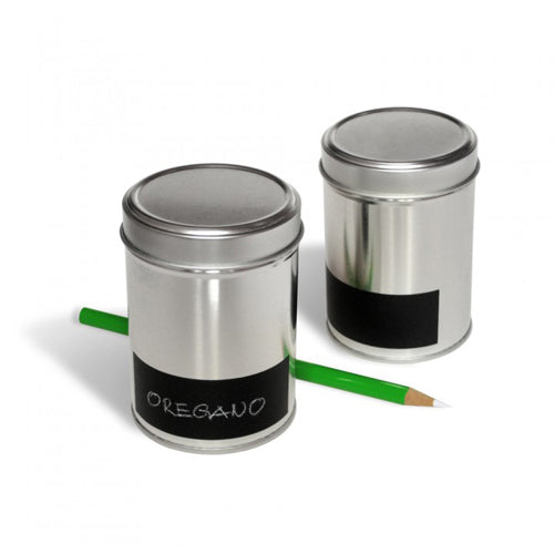Six spice tins in a set with blackboard foil for self-labeling, matching the Gourmet spice rack.