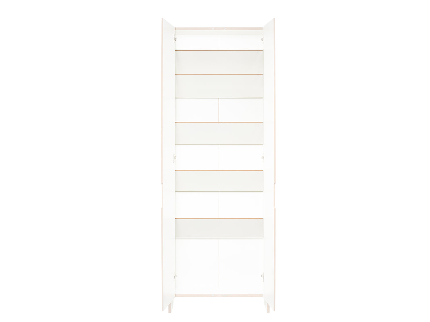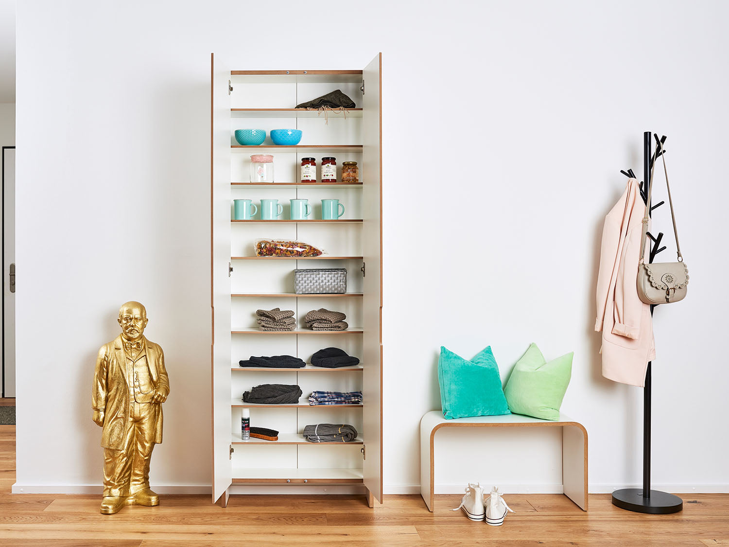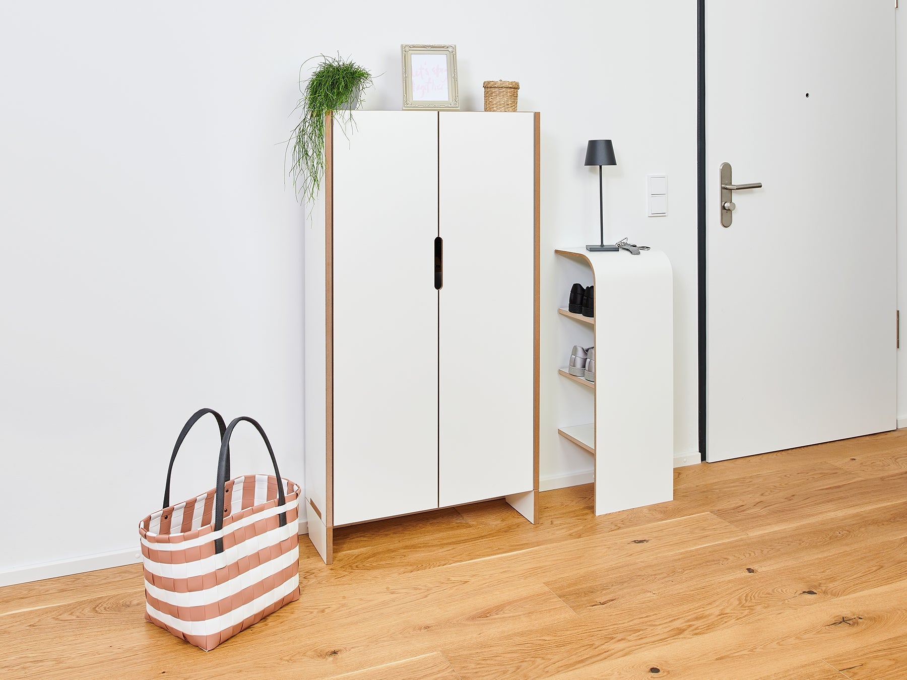 Thanks to its flexible shelves—either straight or angled—the Tojo flat man can be customized. As a shoe cabinet, it offers space for up to 15 pairs of shoes. Those who need additional storage space can expand the cabinet with additional compartments (a set of five).