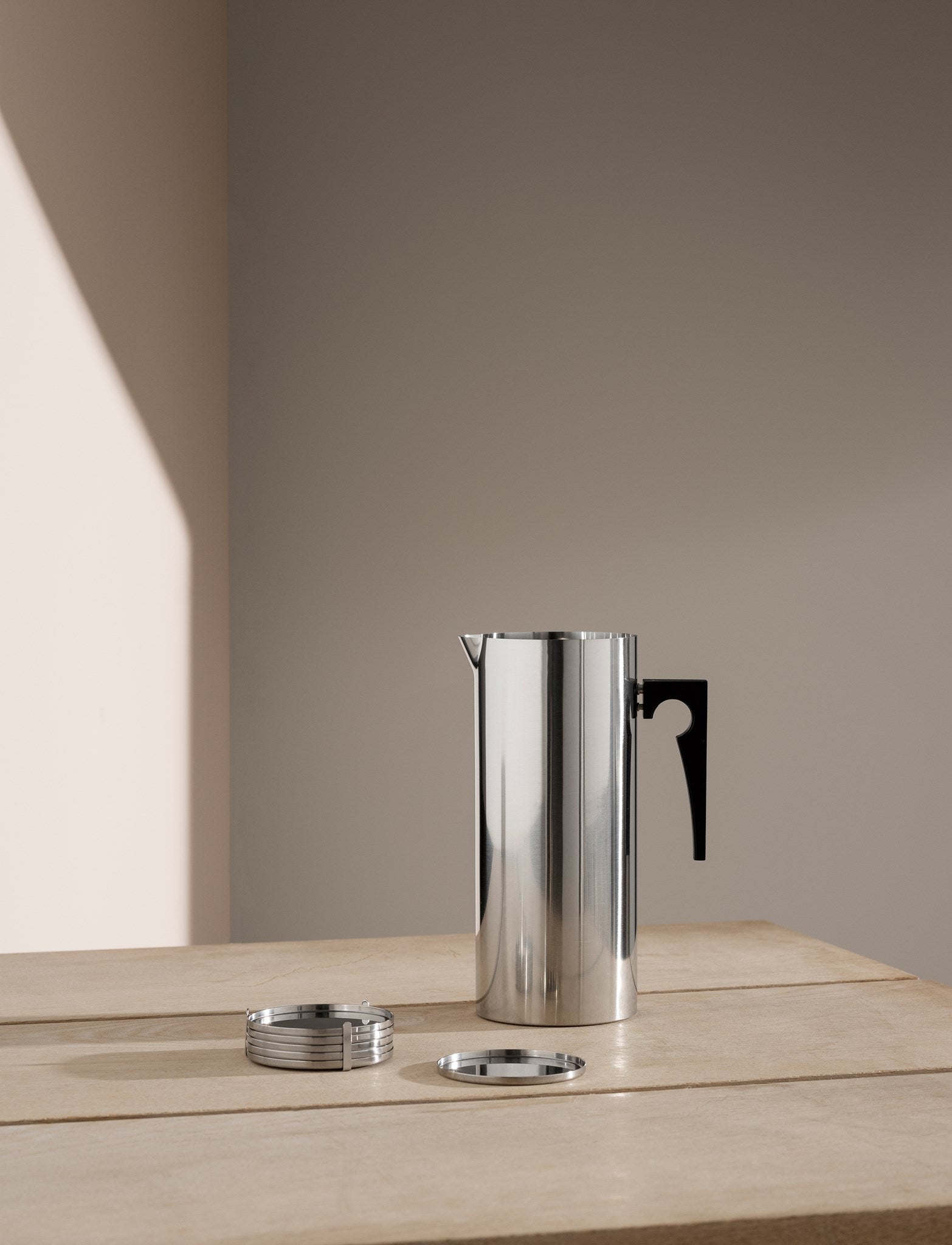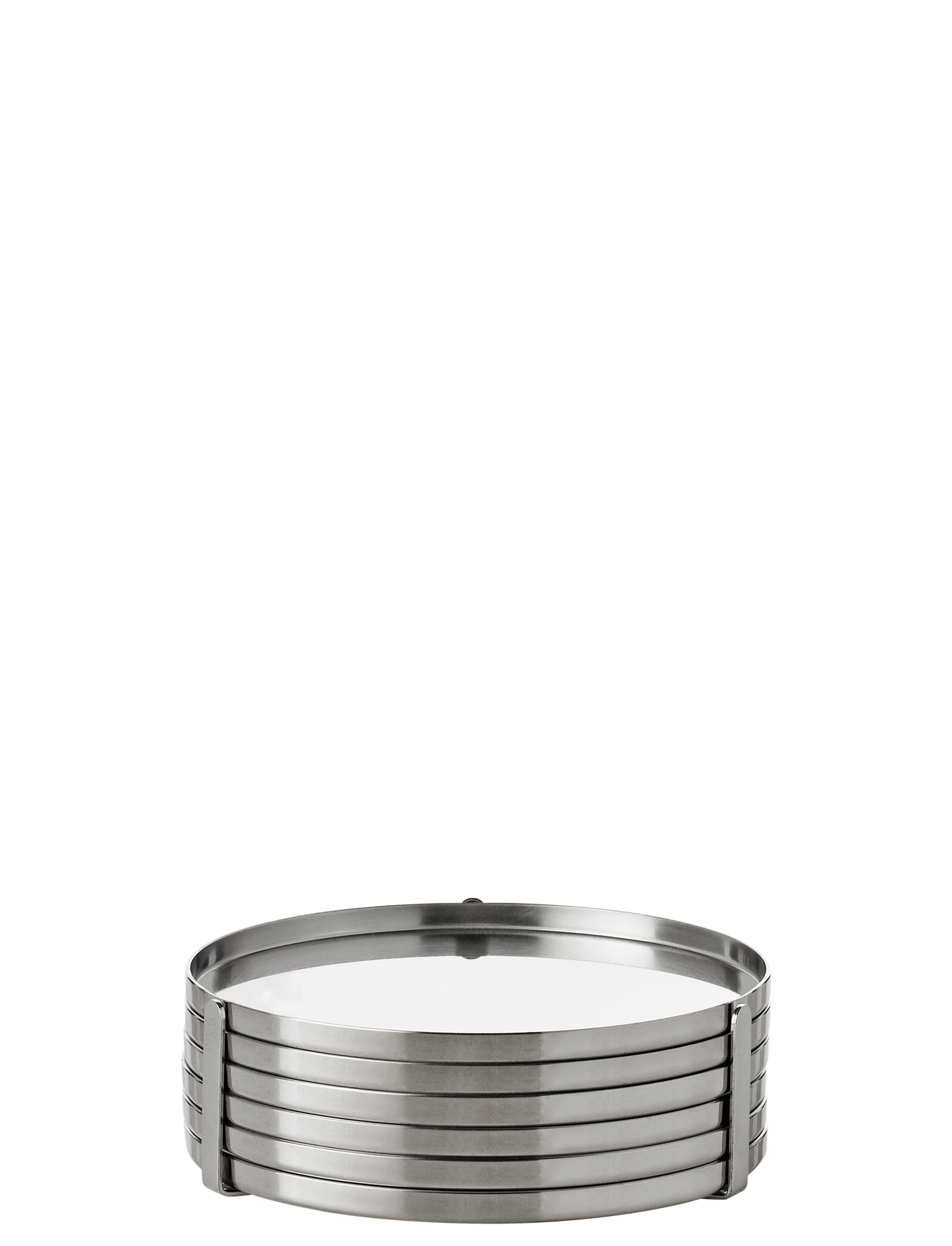 Zylindrische Eleganz für Ihre Gläser mit den Gläseruntersetzern von Arne Jacobsen. Das Set besteht aus sechs Gläseruntersetzern und einem schlichten Ständer, auf dem die Untersetzer gestapelt werden können, wenn sie nicht in Gebrauch sind. Die Untersetzer sind aud Edelstahl und haben einen Durchmesser von 8,5 cm. Mit den Untersetzern vermeiden Sie Tropfen und Glasränder auf dem Tisch.