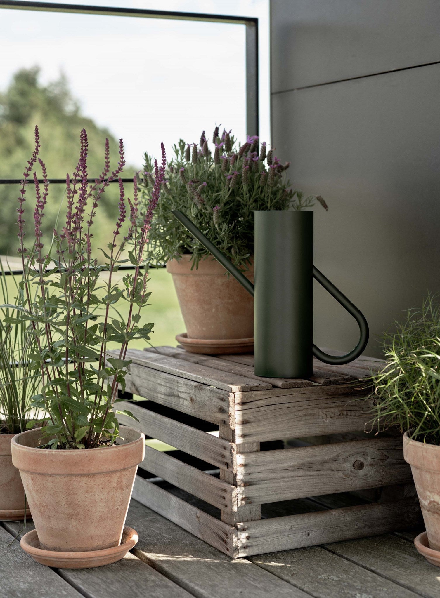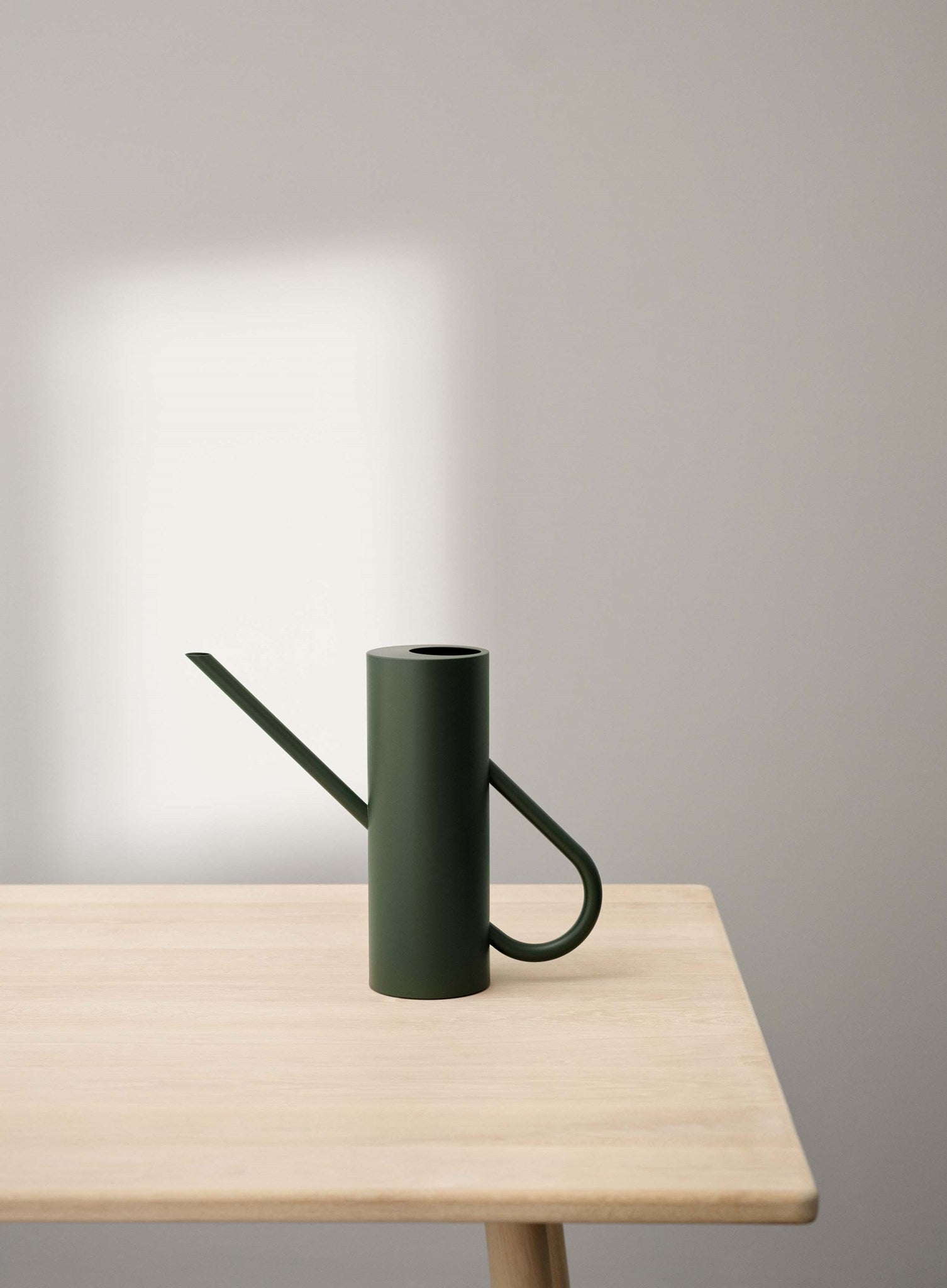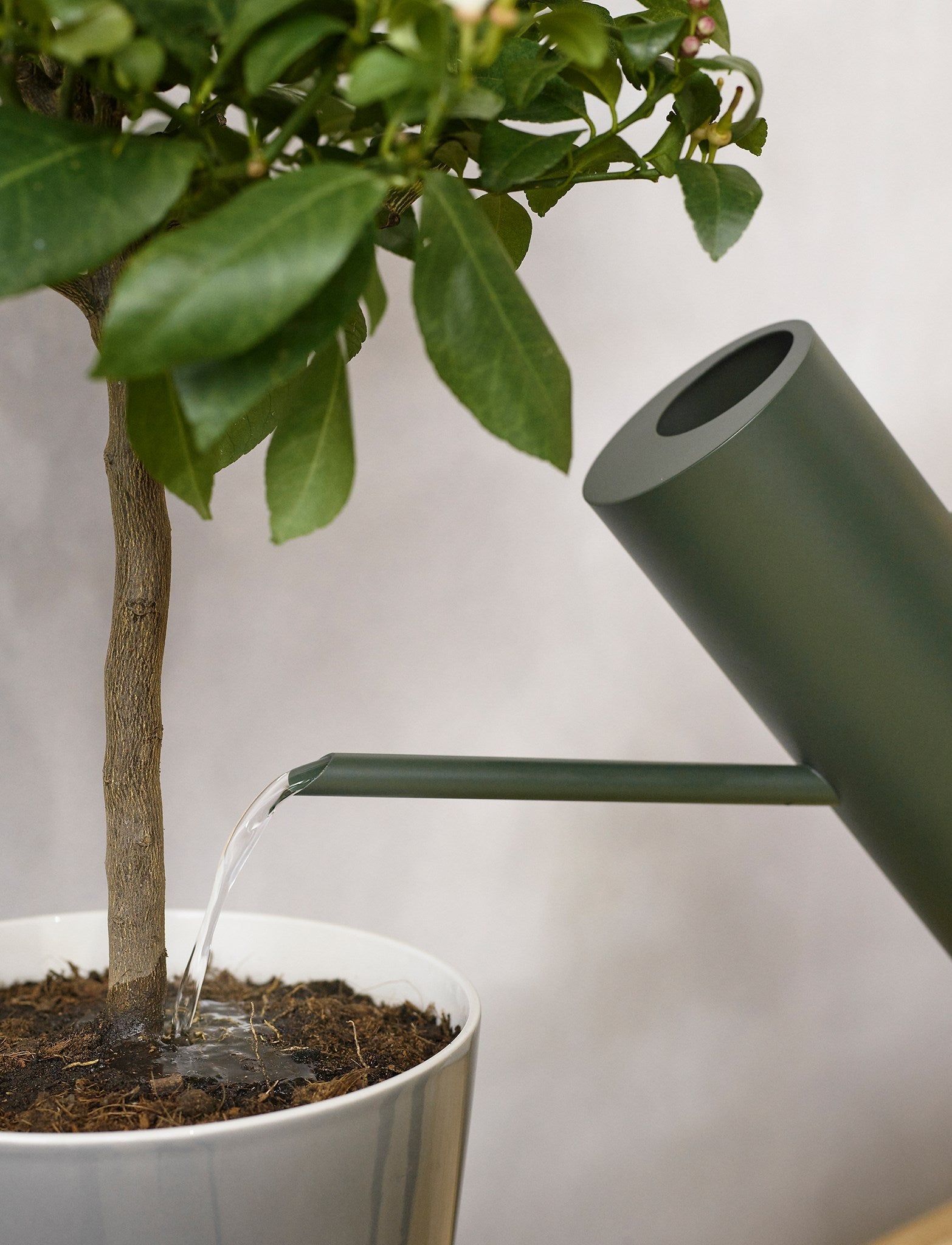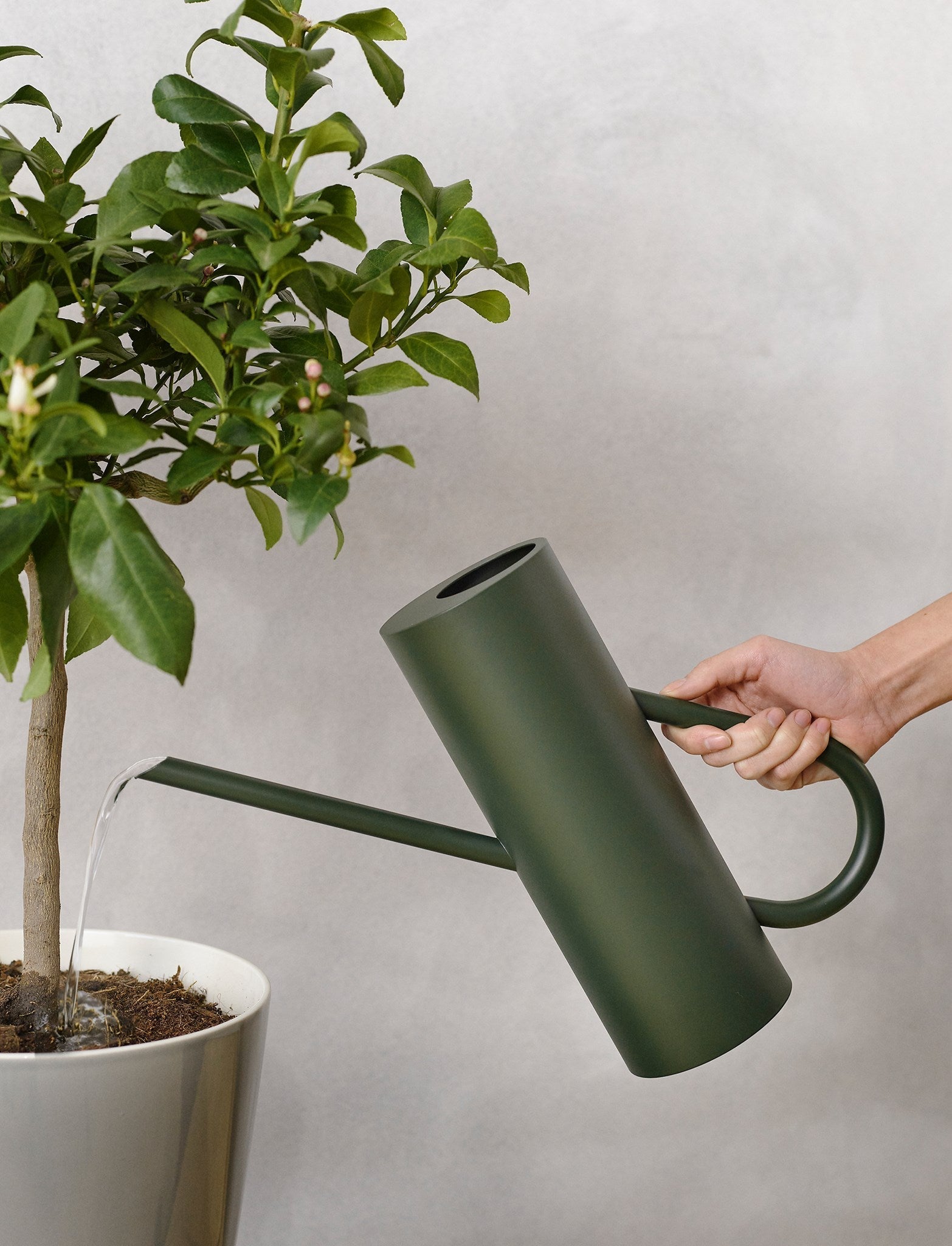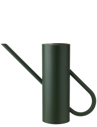 Bloom ist eine stilvolle Zimmergießkanne aus pulverbeschichtetem Edelstahl mit matter Oberfläche in einem schönen, dunklen Grün (Pine). Hinter dem Design steht das deutsche Designerduo Böttcher & Kayser, dessen Ziel es ist, schlichte, originelle Produkte ohne überflüssige Details zu entwerfen. Die Zeitlosigkeit und Stärke zylindrischer Formen hat das deutsche Designerduo zu dieser modernen Interpretation einer klassischen Gießkanne inspiriert, mit einer Anspielung auf das Design der Isolierkanne EM77, die ein wichtiger Teil der Geschichte von Stelton ist. Mit ihrer schlichten Formensprache, bei der Henkel und Ausgießer durch die Kanne miteinander verbunden zu sein scheinen, trifft Ästhetik auf Funktionalität, da die Kanne neben ihrer eigentlichen Aufgabe auch dekorativ in Szene gesetzt werden kann. Der lange, schmale Ausgießer erleichtert das Gießen kleinerer Töpfe, ohne dass Wasser verschüttet wird. Das intelligente Design sorgt für eine tropffreie Gießkanne. Unter dem Boden der Kanne befindet sich eine gerillte Silikonmatte, die für Rutschfestigkeit sorgt.