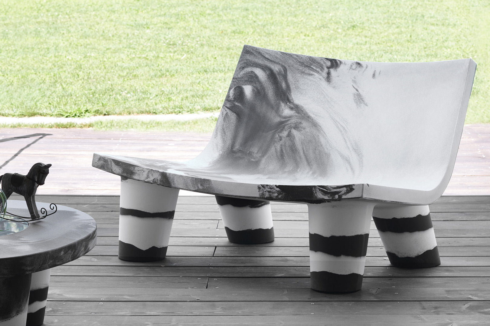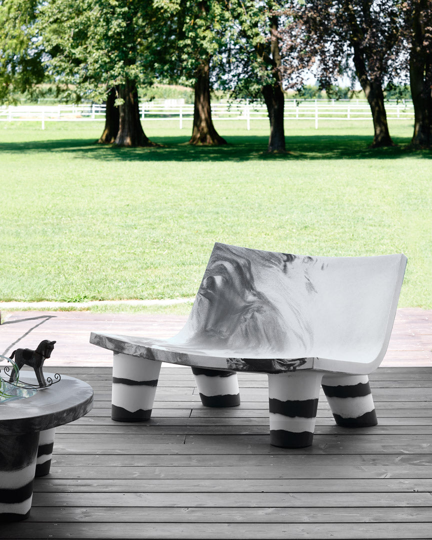 Zur Feier des Geburtstags des ersten ikonischen Produkts der Kollektion kleidet sich auch Low Lita Love in der speziellen zweifarbigen Textur, die in Zusammenarbeit mit Paola Navone entworfen wurde. Die Nuance Schwarz & Weiß, die das volle Potenzial des Rotationsformens ausschöpft, macht jedes Stück einzigartig und nicht reproduzierbar.