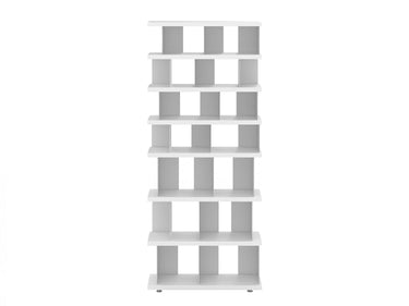 Das freistehende Designer-Regal kombiniert weiße MDF-Böden mit hellgrauen, pulverbeschichteten Aluminium-Winkelstützen. Diese sind bereits vorgebogen und lassen sich ohne Werkzeug schnell und einfach einsetzen. Zwei unterschiedliche Höhen der Winkel sorgen für eine optimale Organisation verschiedener Buchgrößen – ein durchdachtes Regalsystem mit minimalistischem Design.