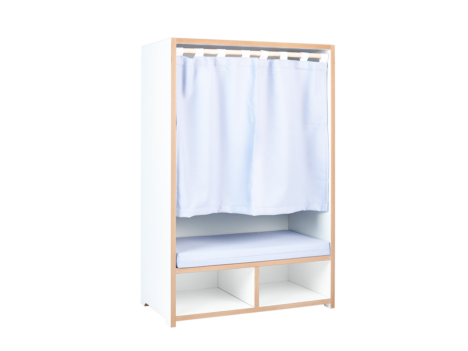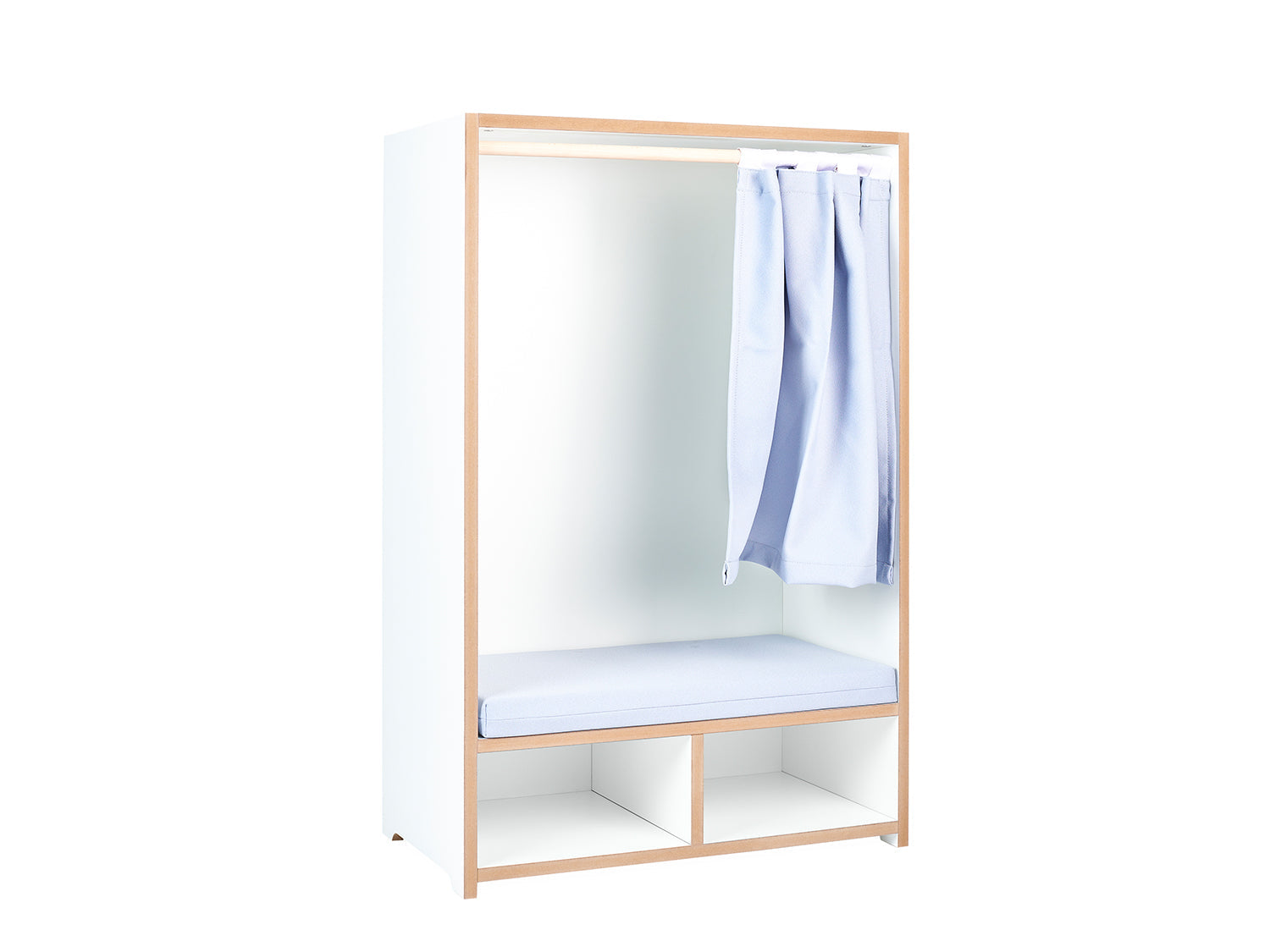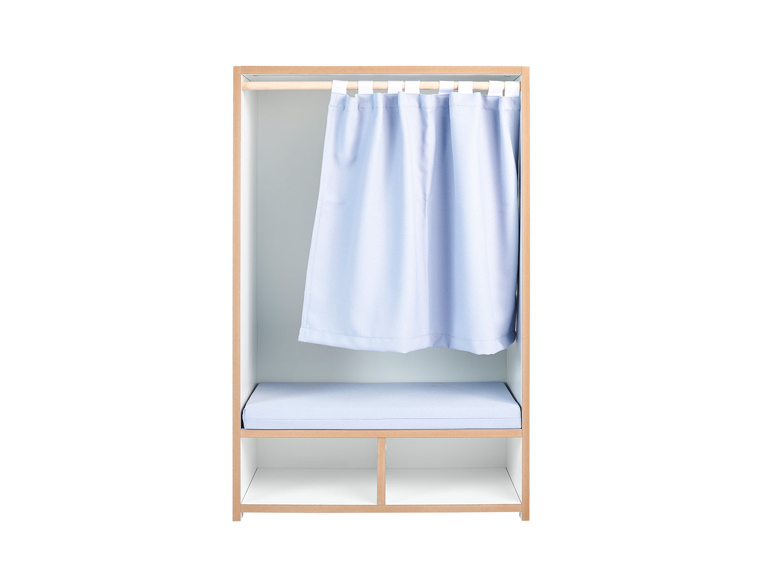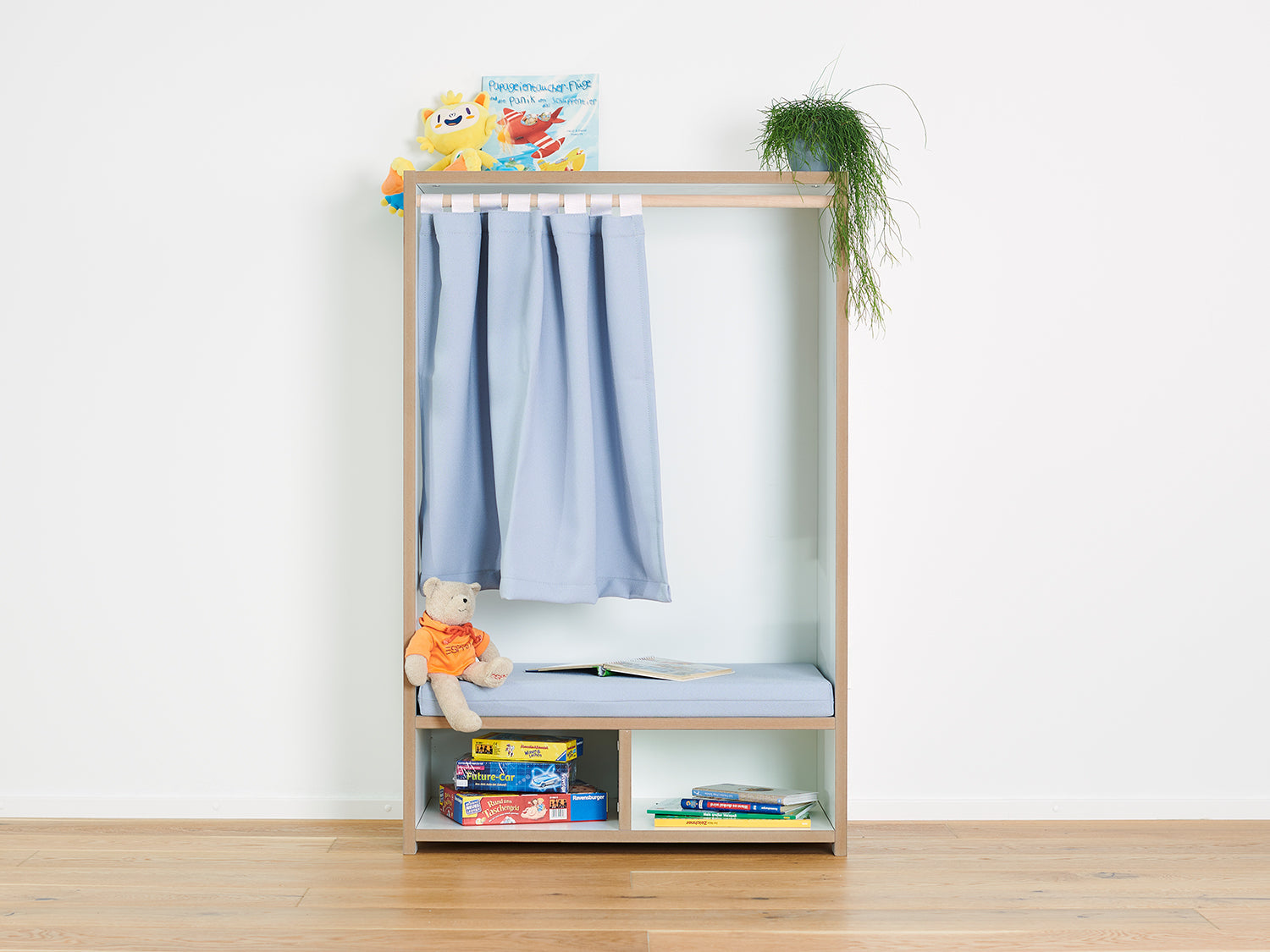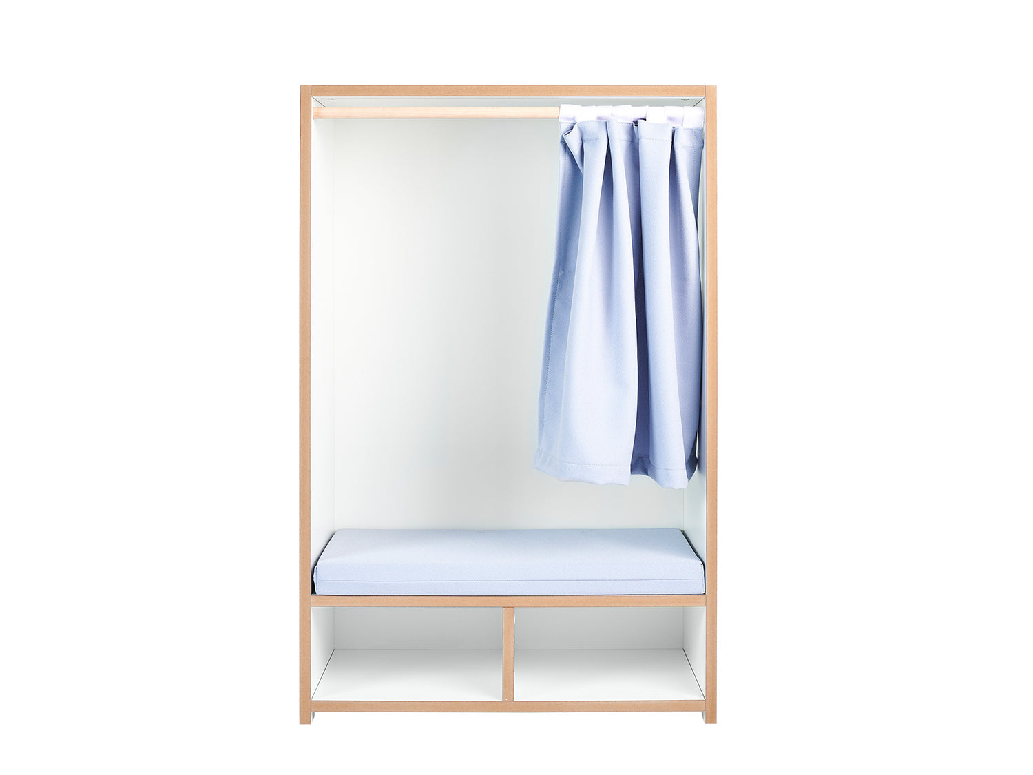 | Material | MDF beschichtet, Stange aus Buche natur, Vorhang und Matratzenbezug aus Xtreme Camira (100% recycelter Polyester) |